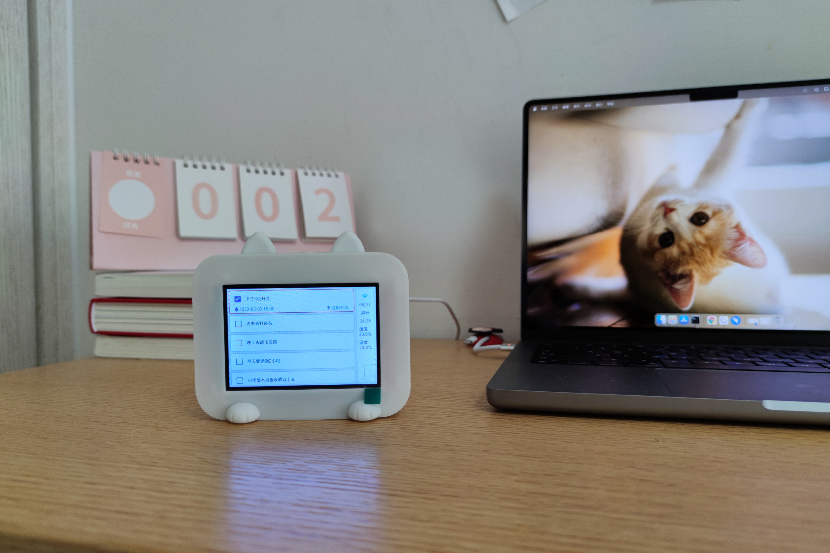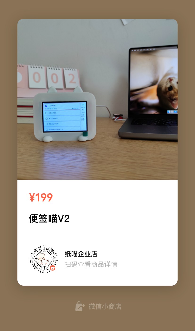 便签喵是一个桌面便签小摆件,通过小程序可以实时编辑便签待办,同时支持便签提醒、时钟、温湿度等功能,这是我们研发的第一个物联网设备,很有里程碑纪念意义